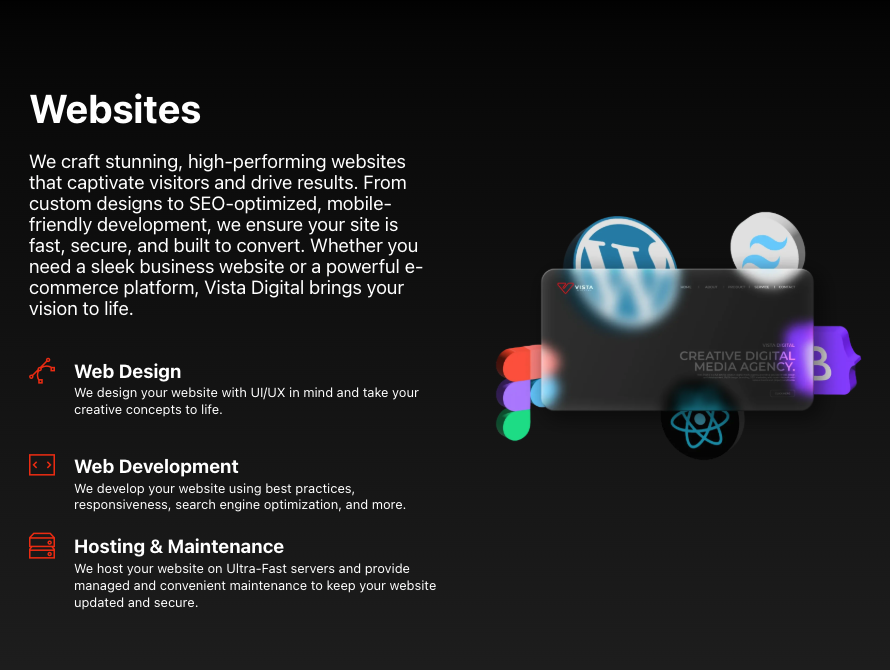 Did you know that VistaCRM also has services to help you success online? From Web Design & Development, Logo & Branding, to Marketing and Content creation. We can help you create an online presence for your business.